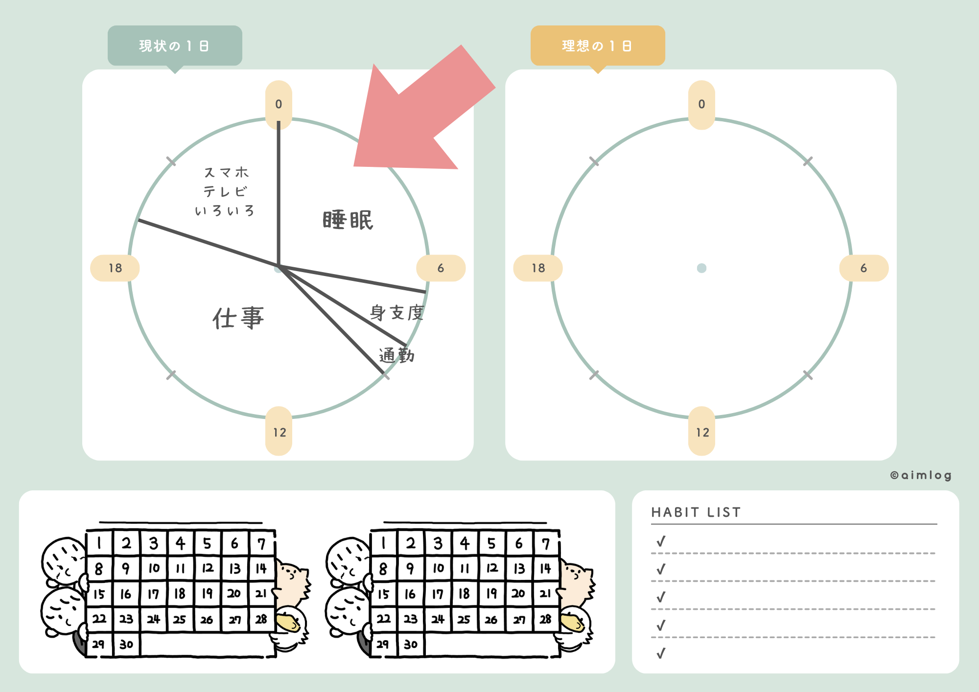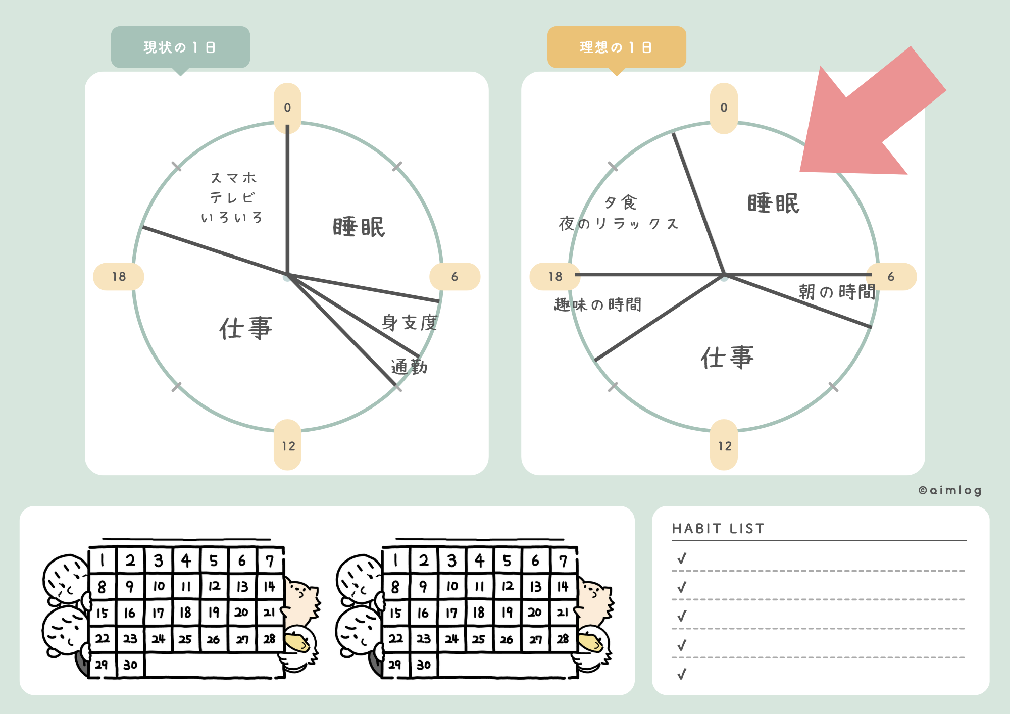 - 「今の1日」と「理想の1日」を比較することで、理想の暮らしが見えてくる