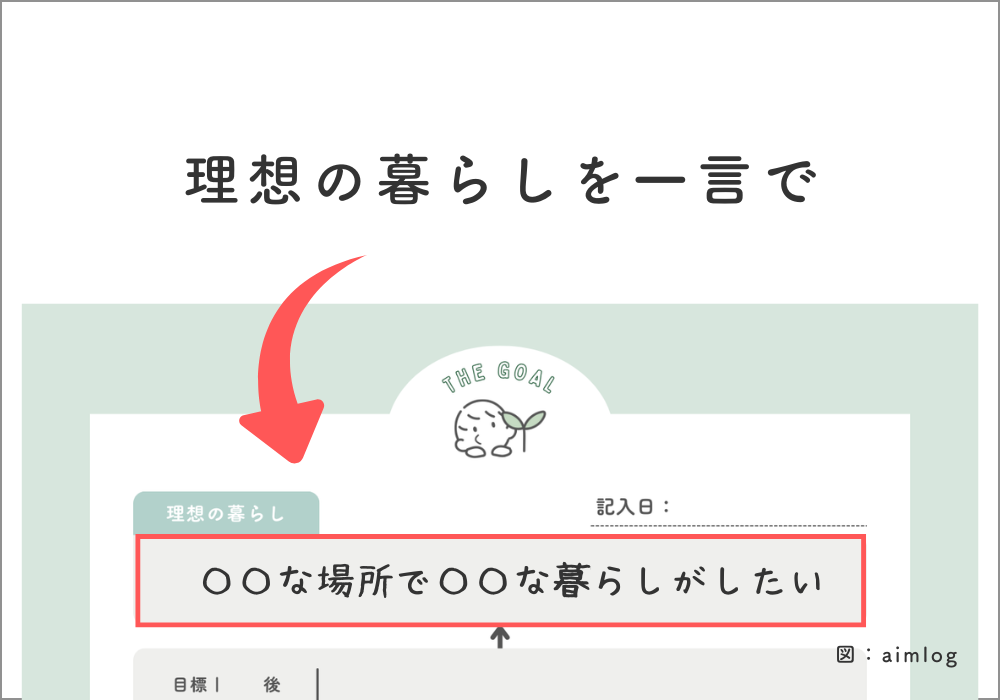 そしてその一言でまとめたものを、下記のシートの一番上「理想の暮らし」に記入していきます。