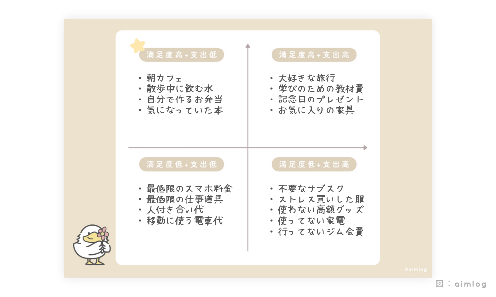 - 高満足×高支出は効率化、高満足×低支出は増やす