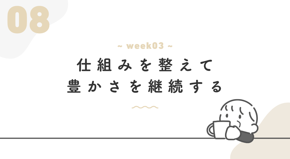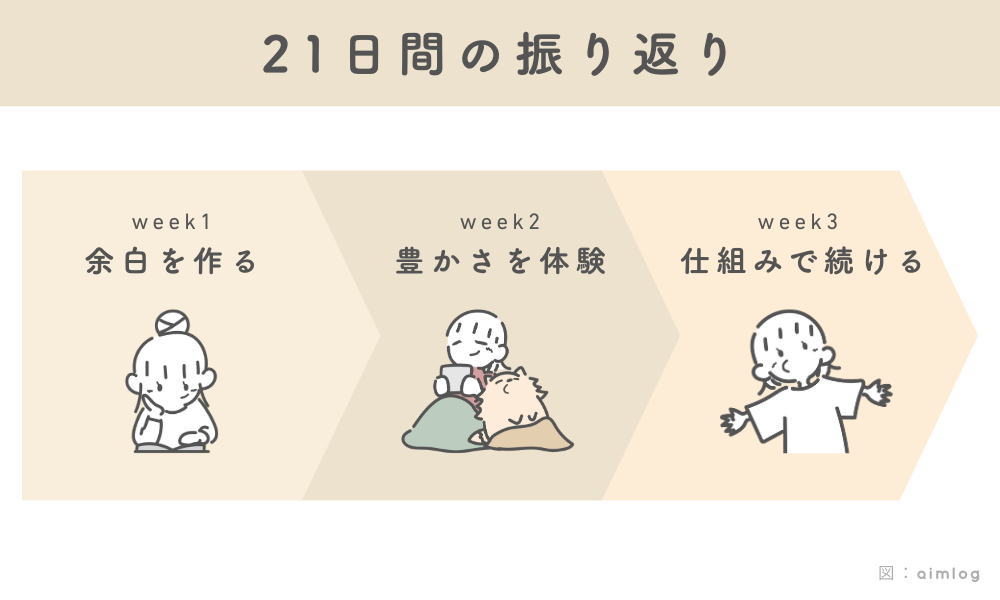 week3を終えると、あなたは「余白を作り、豊かさを味わい、仕組みで続ける」という3つの流れを体験しました。