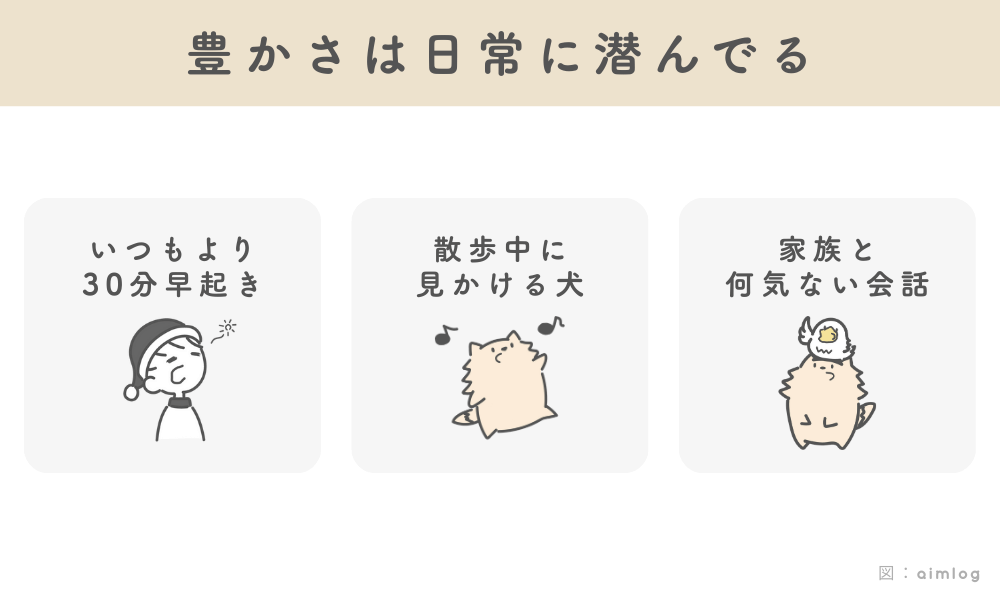 僕の場合、朝の光を浴びながらコーヒーを淹れる時間や、散歩中に見かける犬を見ることで、毎日の満足感が増しました。